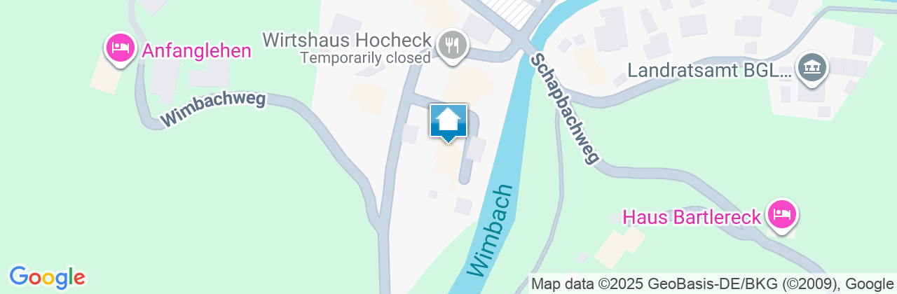 Freeway A 8 Munich / Salzburg to exit Bad Reichenhall, continue on the B 20 via Bayrisch Gmain, Bischofswiesen, direction Ramsau. After the rock tunnel next turn left, over the Wimbach bridge, straight ahead, after the Hocheck inn we are on the left side.Policies